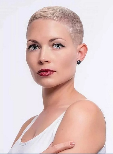 Для особо смелых женщин можно подобрать стрижку ежик, которая практически не оставляет волос на голове. Ежик позволяет создать акцент на глаза и губы, так что всегда помните о грамотном подборе макияжа к вашему лицу.