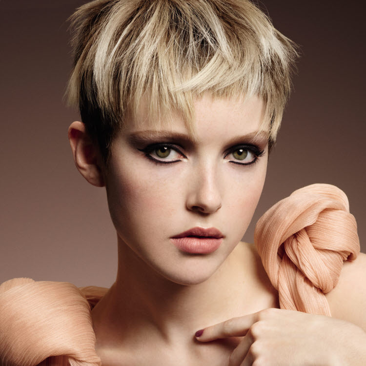 Концы сильно текстурированы для создания острых кончиков и стилизованы в модный петушиный гребешок вдоль верхней части головы. Это создает привлекательную высоту сверху, над короткой бахромой с зазубренным краем, смягчающим линию вдоль лба.
